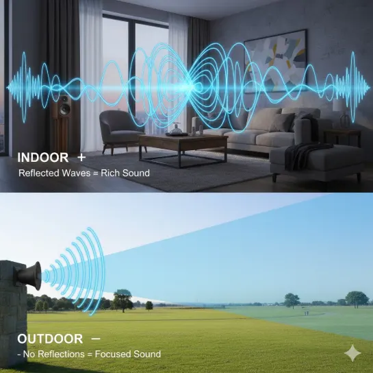 There is a special acoustic problem in outdoor audio. This is achieved by the walls, ceilings, and furniture within the building, which enclose and reflect the sound used to boost the audio signal. Sound spreads, however, far afield. When speakers are not clearly designed for projection, the outcome can be muted loudness or too high, or worse still, annoying dead zones.